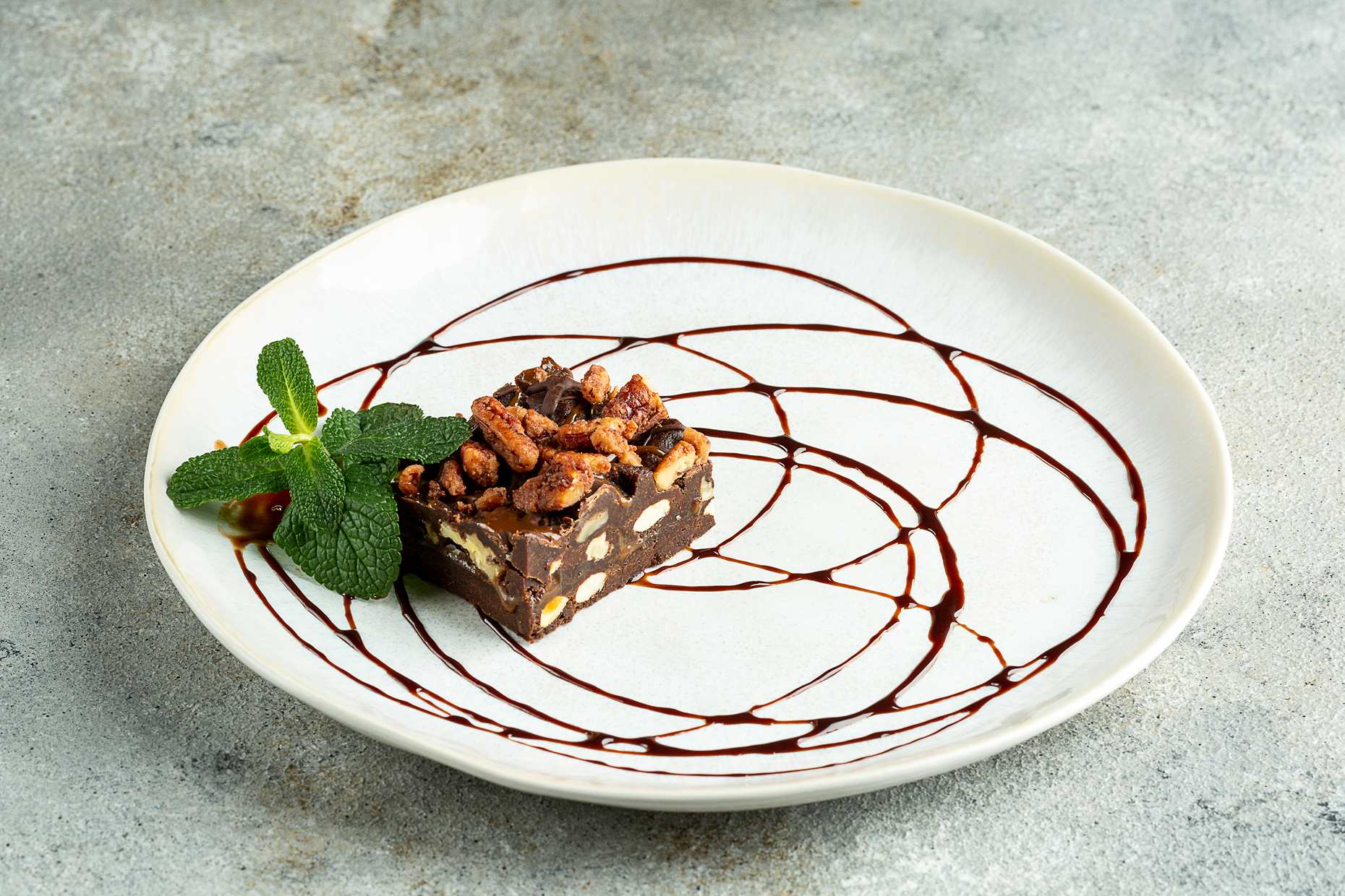Шоколадный десерт с мягкой карамелью, орехом пекан и миндалем.
