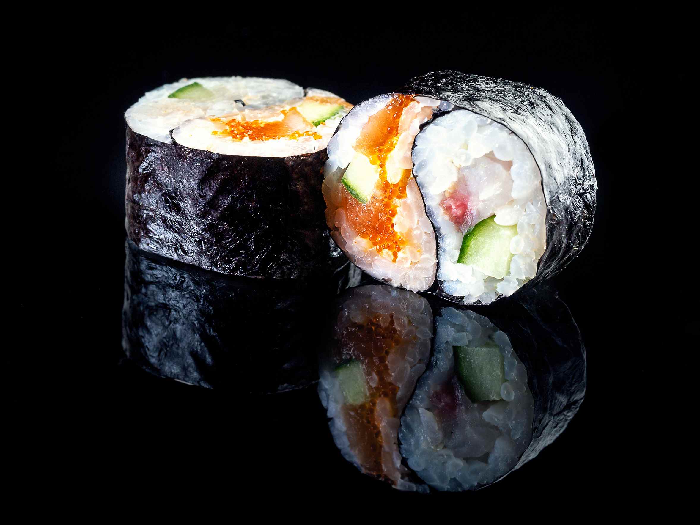Окунь, лосось, тобико, огурец, спайс соус