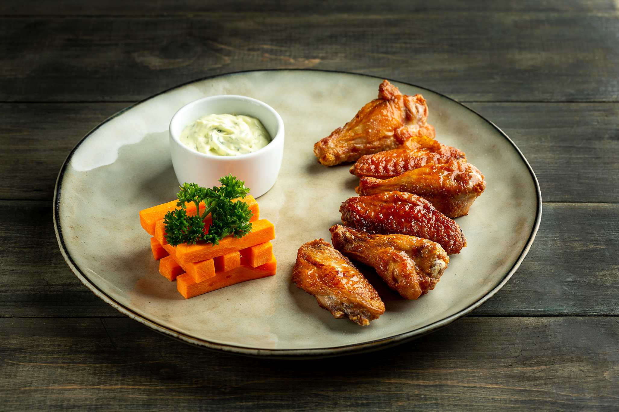 Острые куриные крылышки, подаются со свежей морковью и чесночным соусом 30 мл.