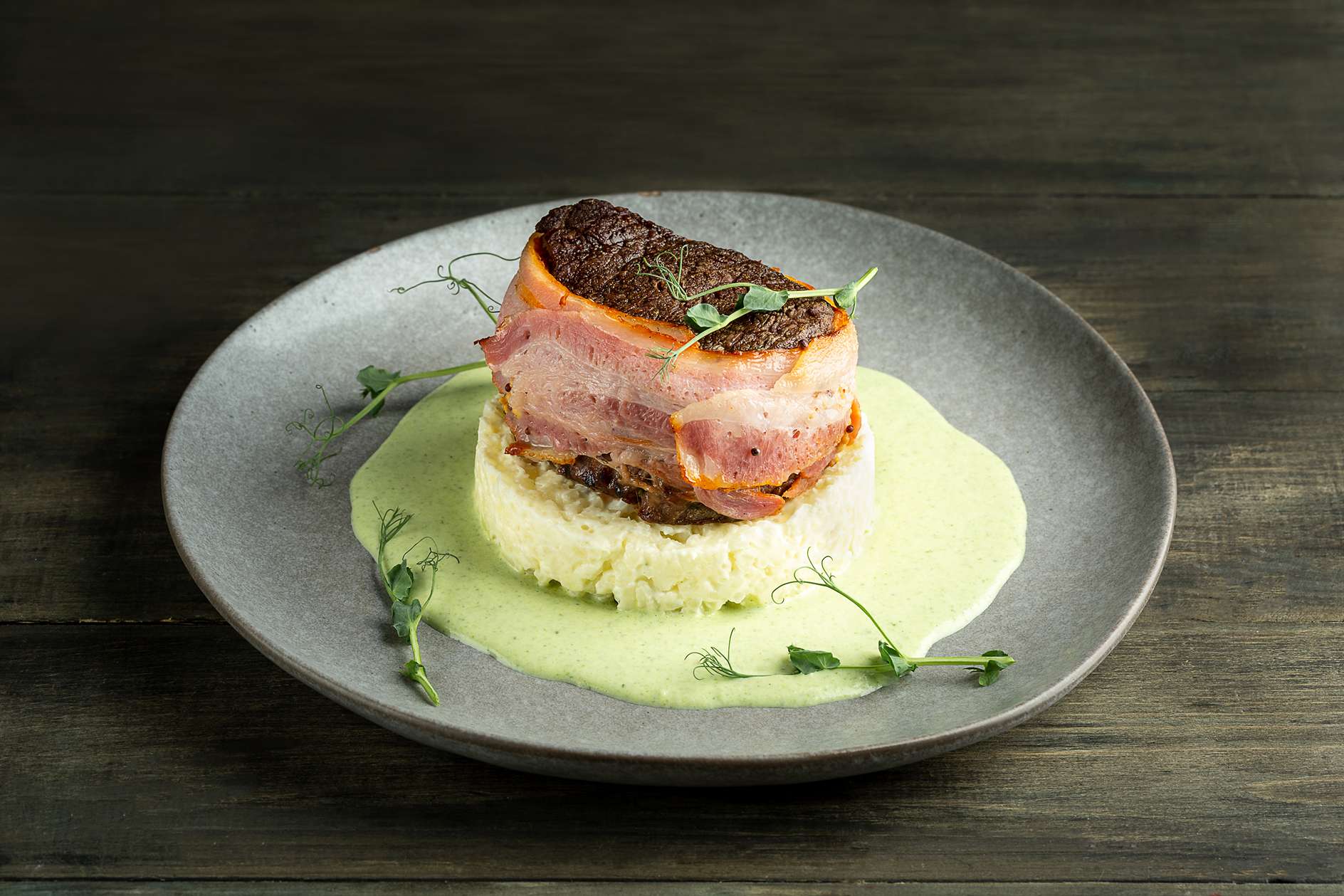 Говяжья вырезка обвернутая в бекон и обжаренная на гриле. Подается с ризотто и соусом цукини.