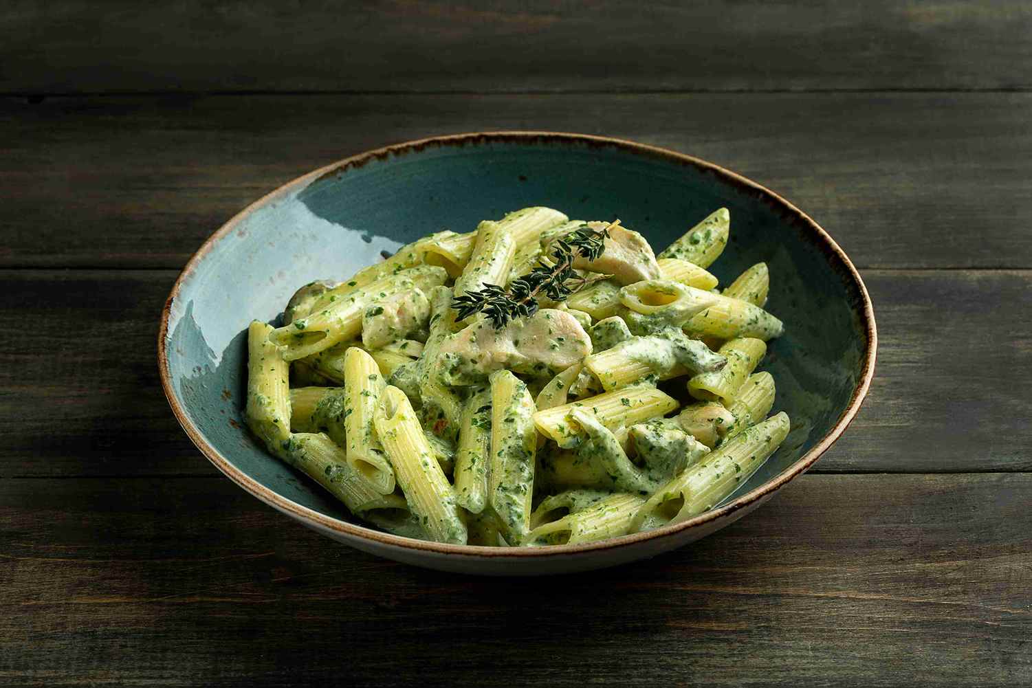 Пенне, куриная грудка, шпинат, вешенки, сливочный соус «Песто», острый перец.