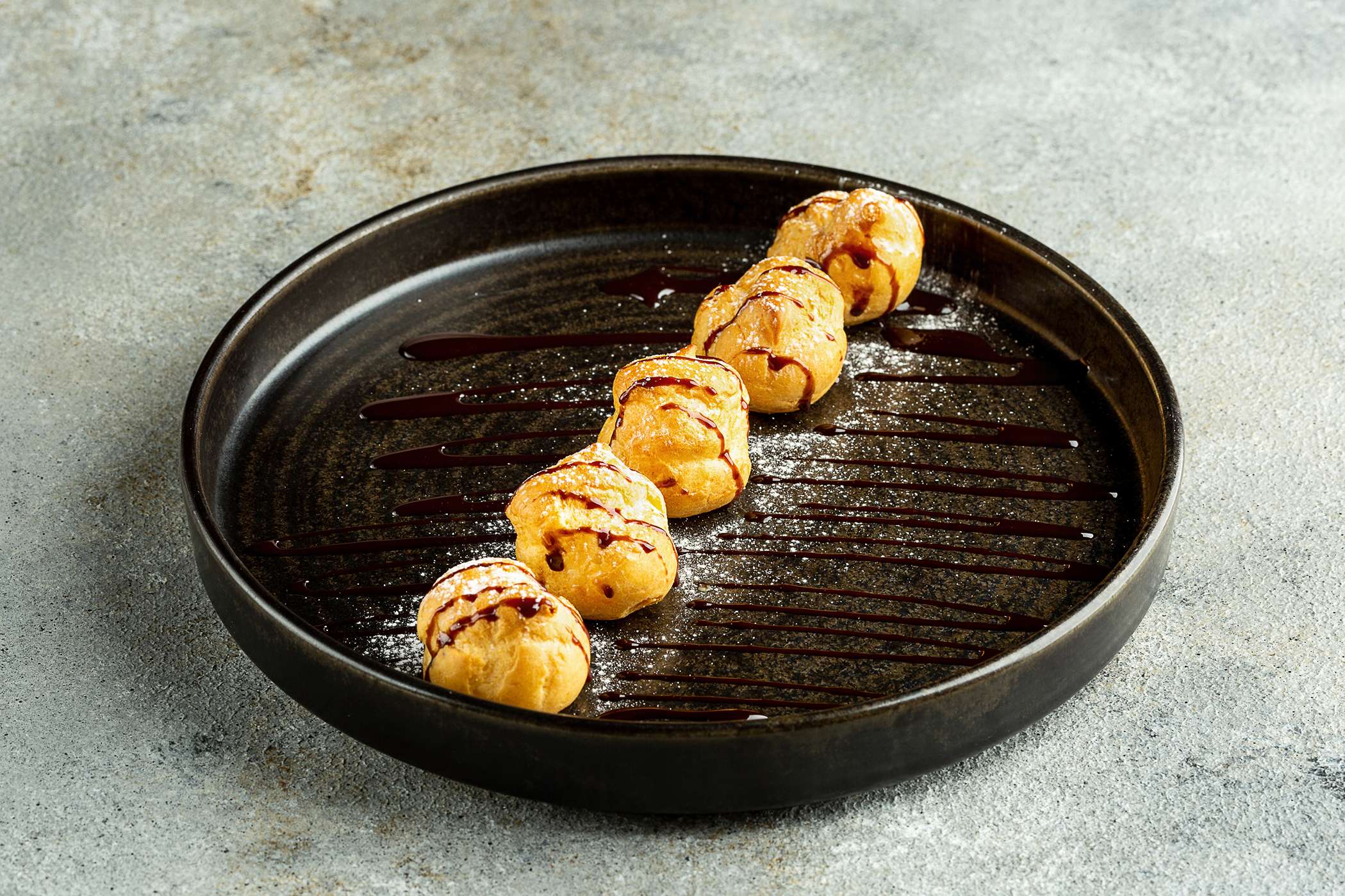 Горячий шоколадный бисквит с жидкой сердцевиной, подается с ванильным соусом.