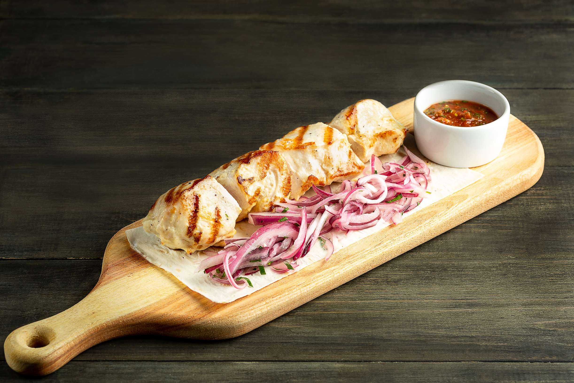 Подается на лаваше с маринованным луком и соусом «Сацибели»