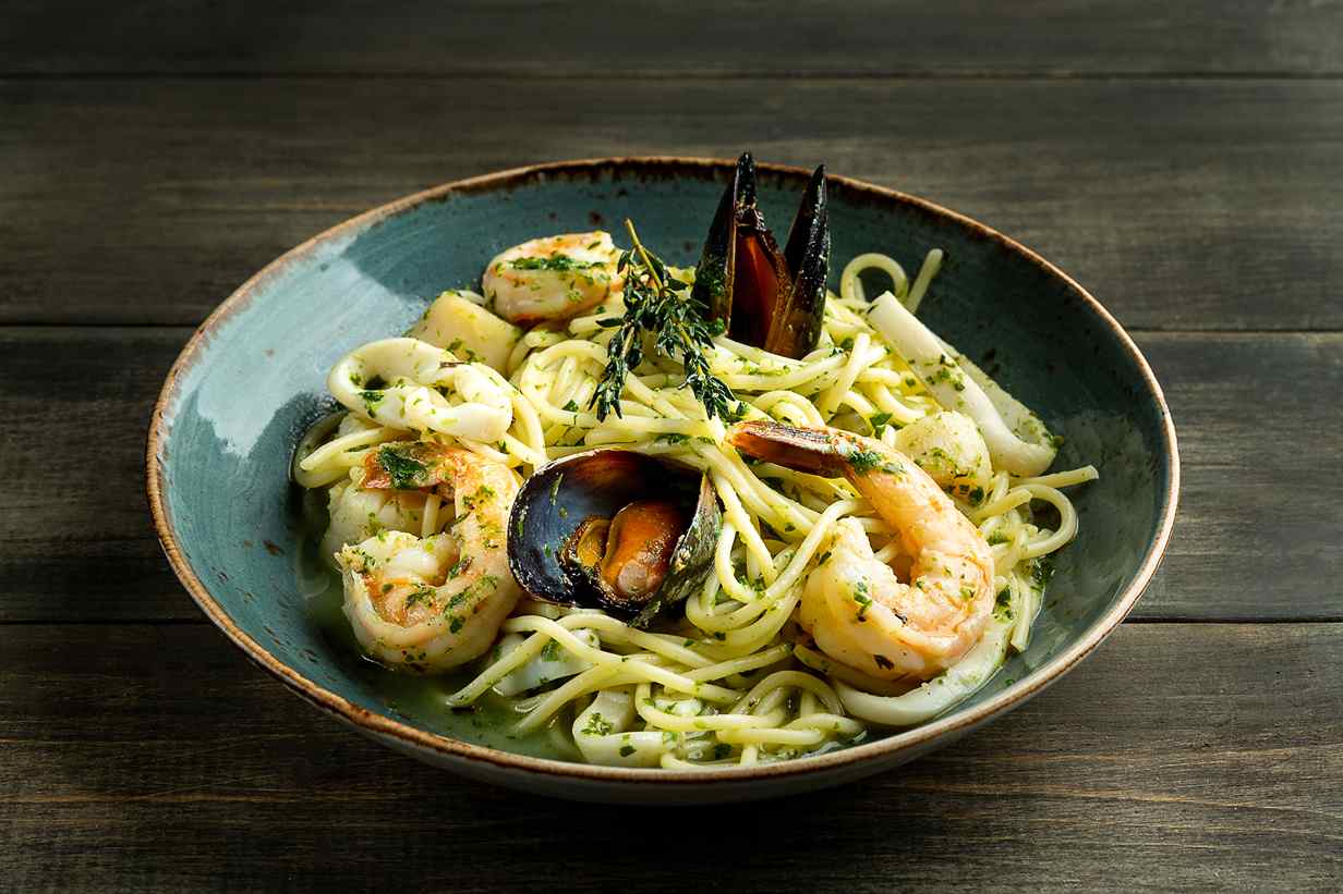 Спагетти, креветки тигровые, гребешок, кальмары, мидии, шпинат.