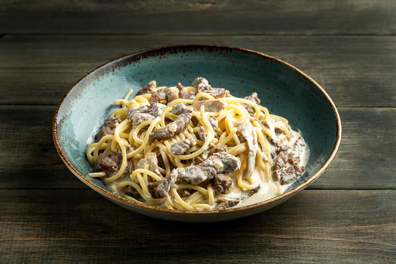 Спагетти, вырезка говяжья, вешенки, лук репчатый, сливочный соус, сыр «Пармезан».